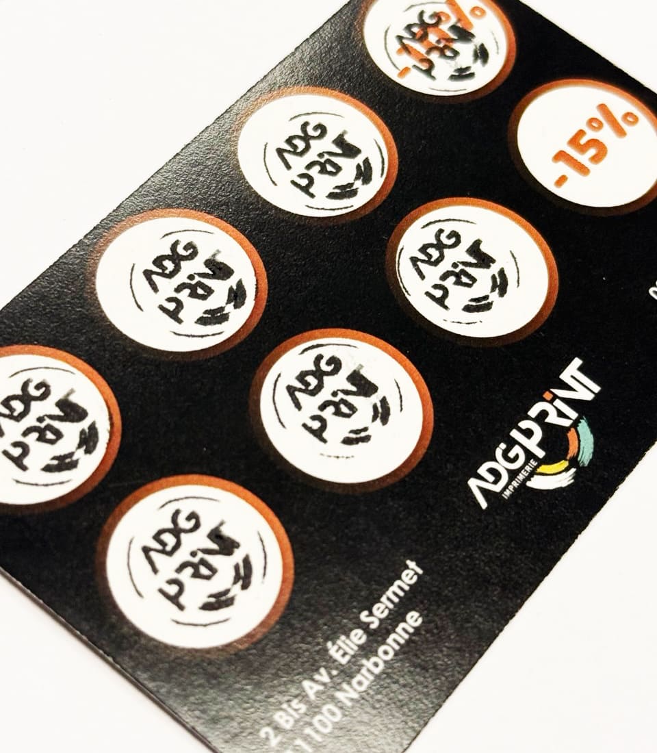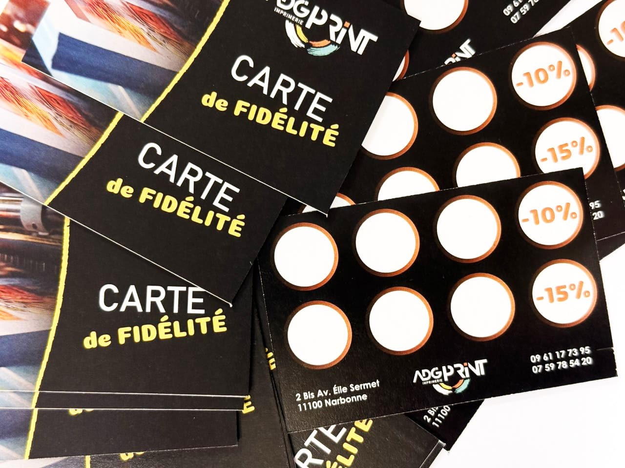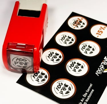 ADG Print propose une solution complète : création du design, impression professionnelle des cartes de fidélité, ainsi que la fabrication de tampons personnalisés pour marquer les visites ou les commandes..